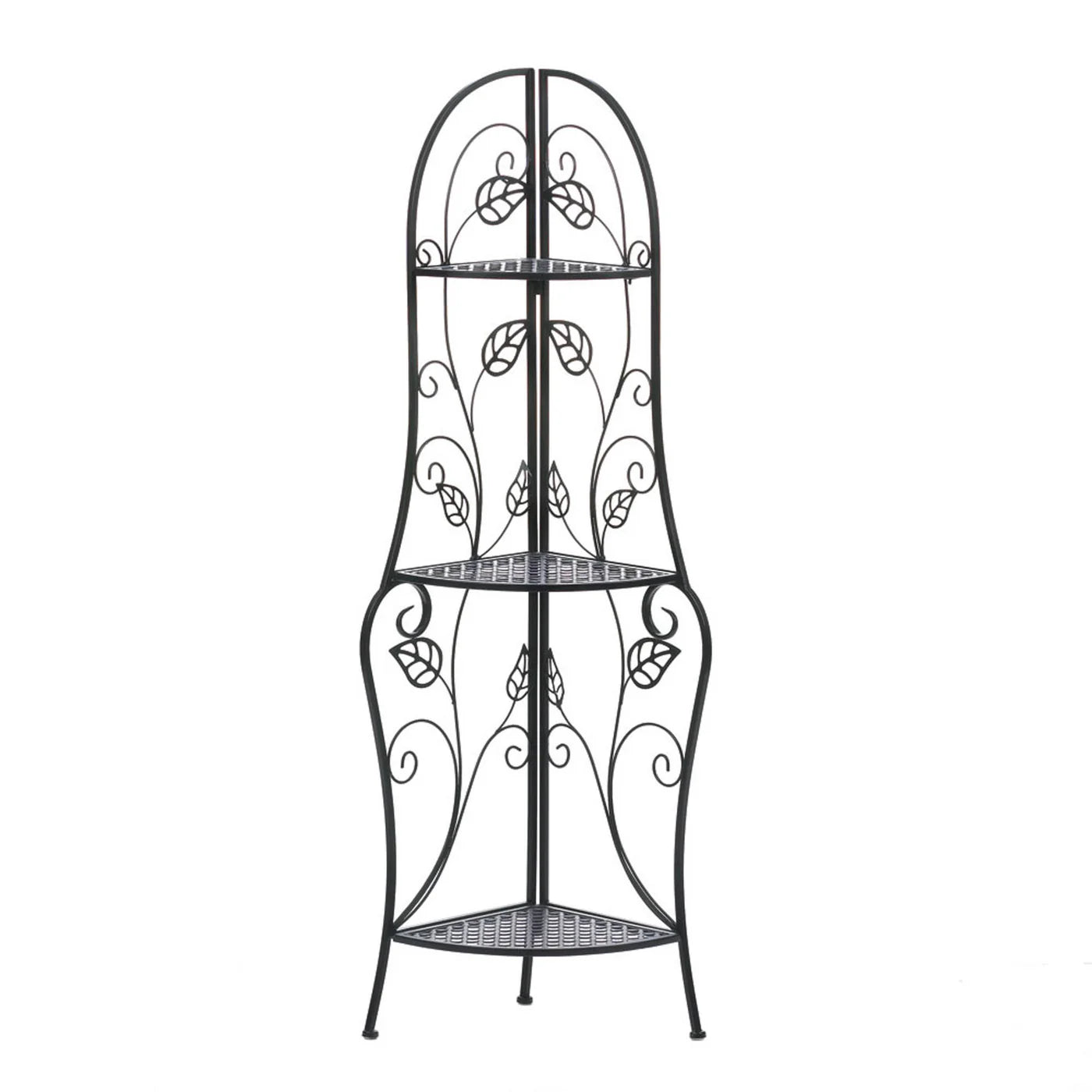 - A sweet treat for any room, this corner baker shelf will display your plants, collectibles and more while enhancing your room with its pretty design. Trellis-inspired shelves climb up the curling metal frame that's decorated with lovely leaves.