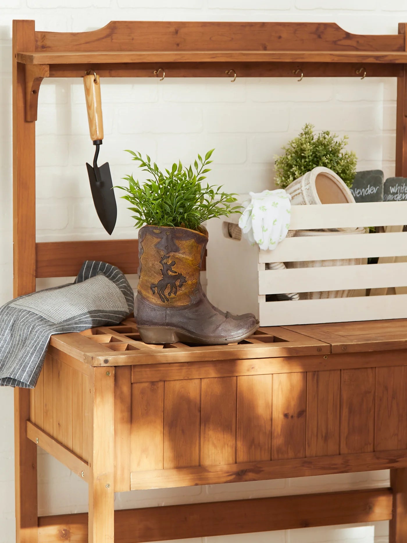 • Some boots were made for walking, but this pair is a playful planter that will show off your cowboy style and your green thumb at the same time. Realistically rustic, right down to the dusty finish, fancy stitching and worn, wrinkled shape!