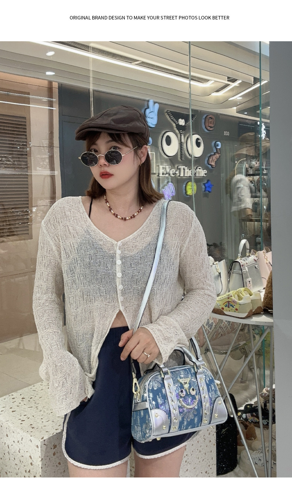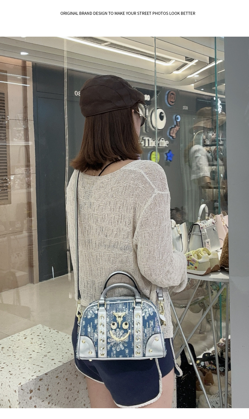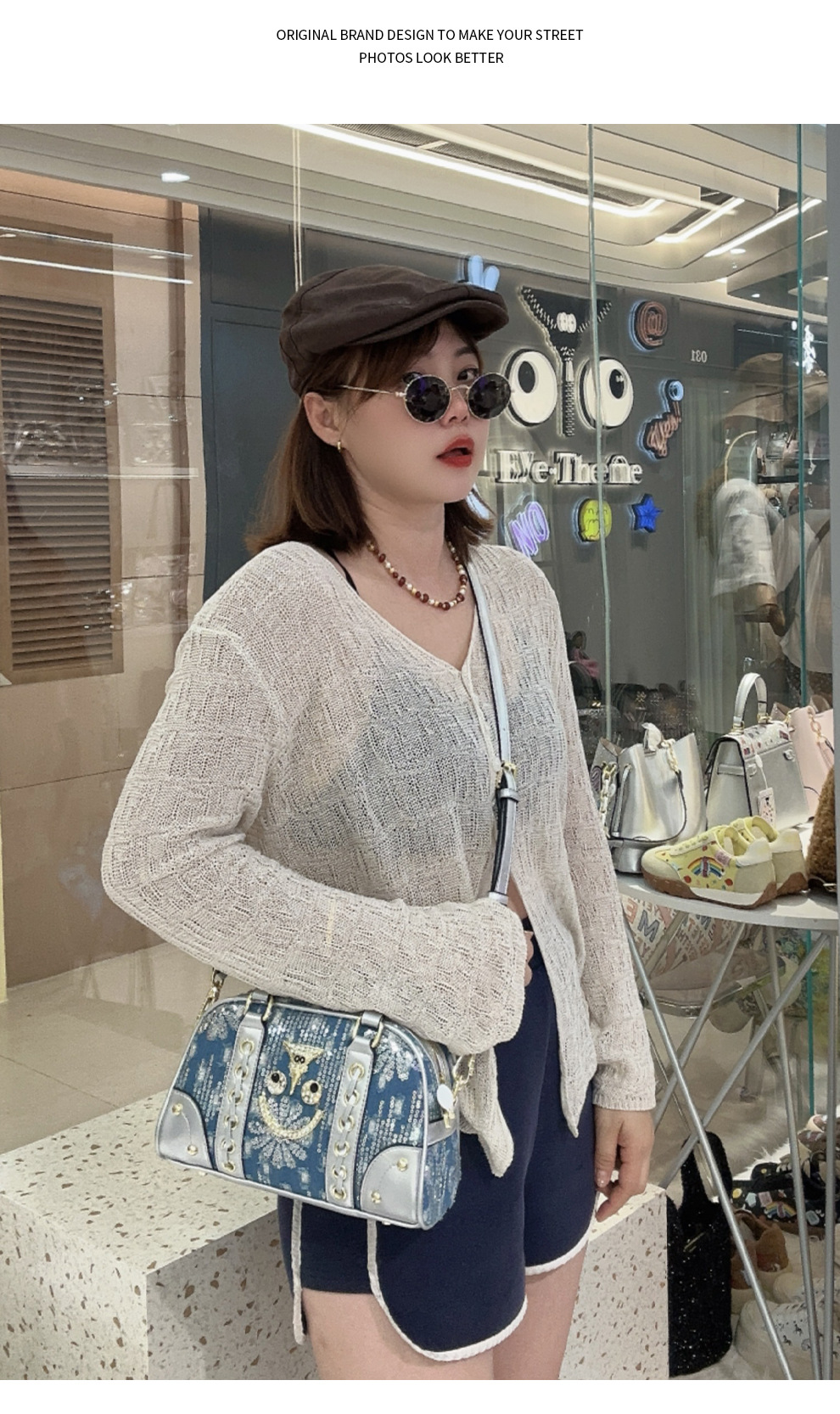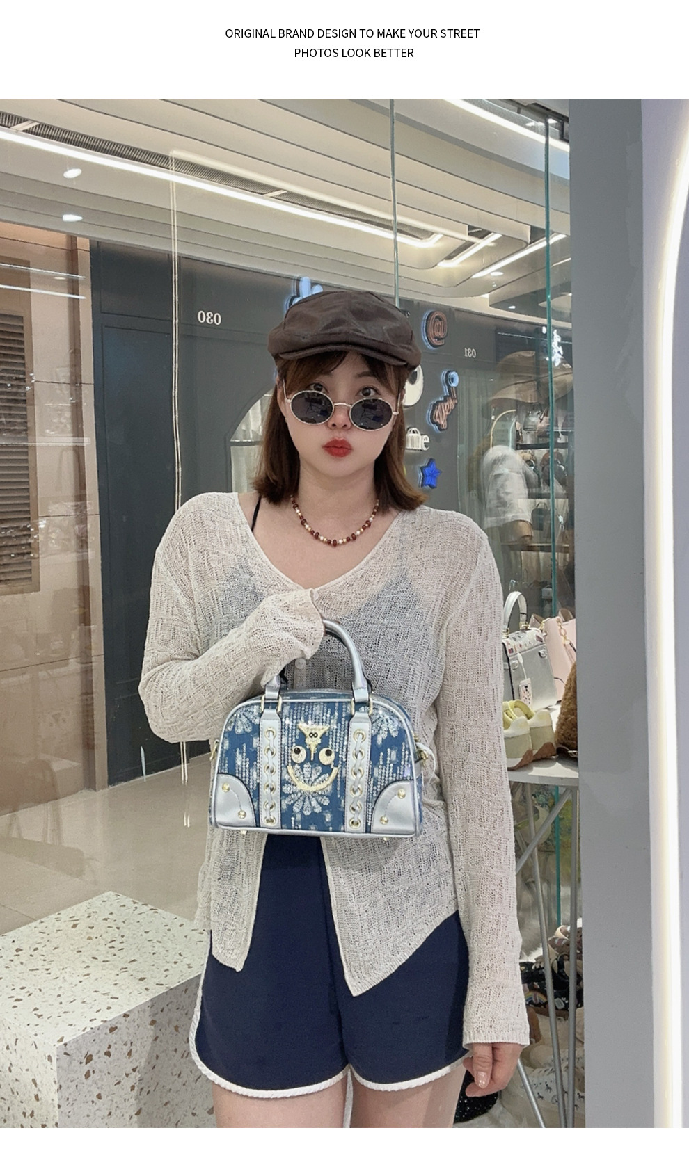 Denim Embroidered sequined Handheld Newspaper 2025 Casual Pillow Shaped Mini Crossbody Newspaper Color Contrast Cartoon