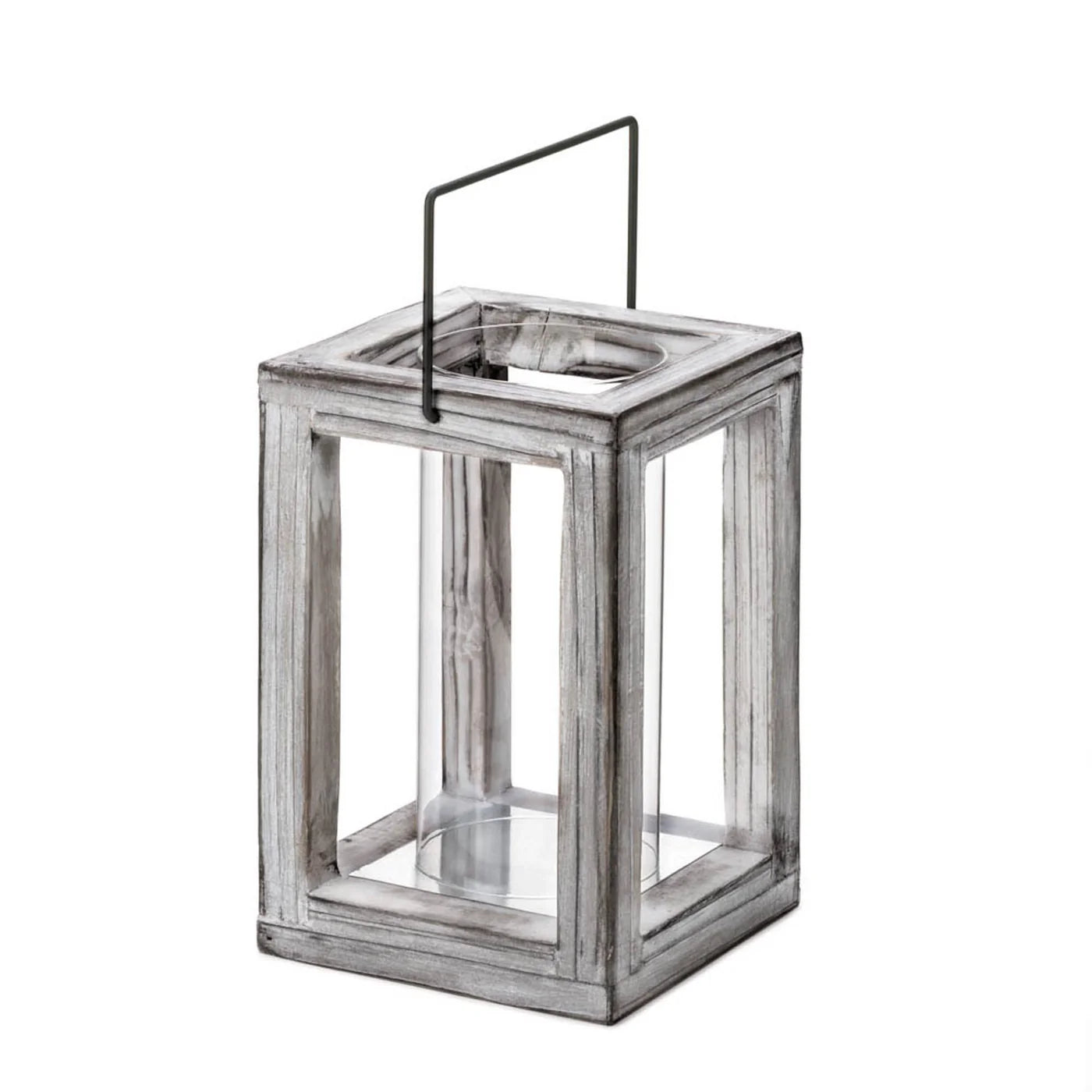 - Give your home or garden the glow of rustic charm with this gorgeously unadorned candle lantern. The rectangular wood base holds a tall, clear glass cylinder that will protect the candle of your choice from the wind. Create a glowing country scene with this homespun lantern by simply adding the candle of your choice!